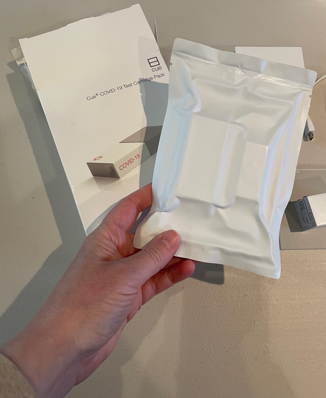An open carton showing one COVID-19 test cartridge in its interior pouch